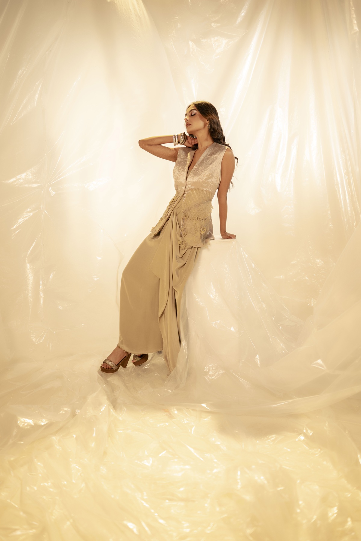 A modern silhouette wrapped in vintage charm, this look brings together a fluid draped dress with a crushed beige jacket that has a soft metallic sheen. The jacket features intricate appliqué work that adds a touch of nostalgia, like something you’d find in an heirloom trunk but reimagined for today. The ensemble moves between eras, polished enough for formal evenings, yet relaxed enough for artful occasions. It’s a look that feels thoughtful and easy to wear.