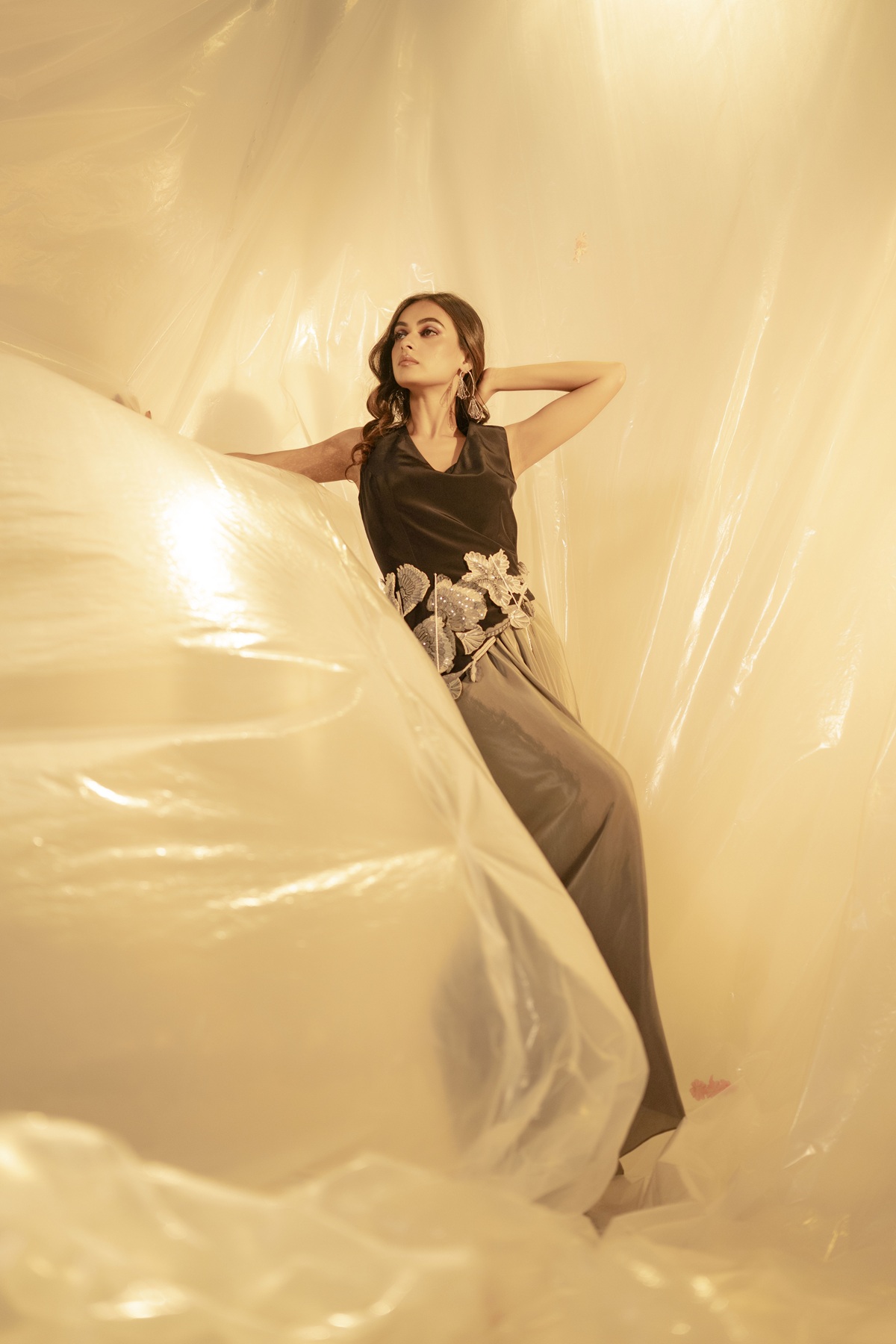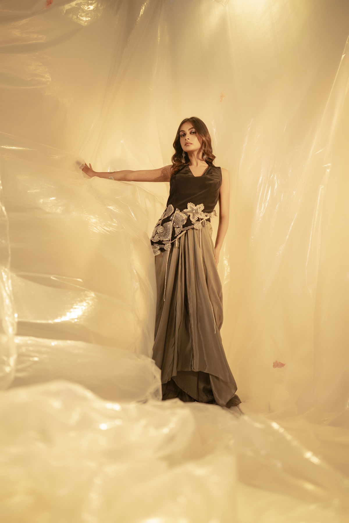 Sculptural and striking, this set brings together contrast and craft in perfect sync. The black asymmetrical top is designed with elaborate gold appliqué, each detail thoughtfully placed to feel more like wearable art than mere ornament. Paired with a soft grey draped skirt, the look balances structure with flow and boldness with grace. Whether worn for a formal evening or an intimate celebration, this outfit is for sure a conversation starter.